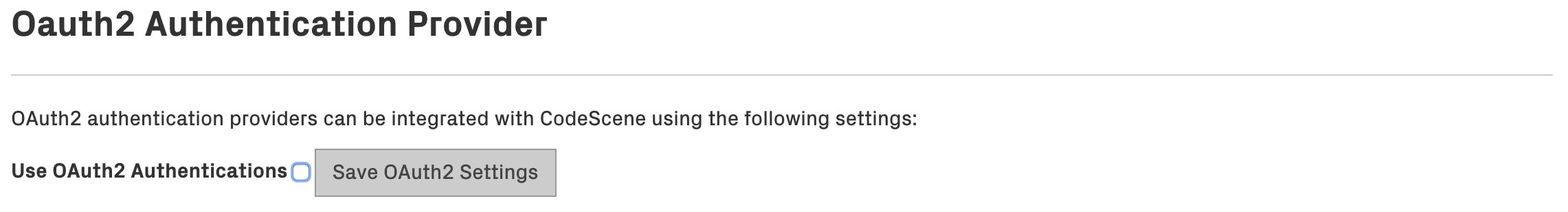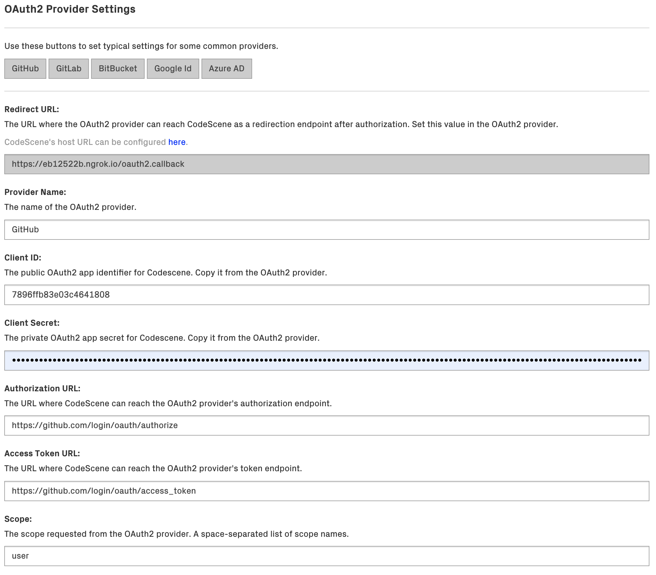 You will need to register CodeScene as an application/consumer at the OAuth2 provider. The provider will then create a Client ID and Secret that you use when configuring the provider in CodeScene. The other settings are specific for each provider, and the buttons at the top can be used to set these to typical settings for some common providers. Note that the scope requested must be such that it gives access to the specified user/team URLs and fields.